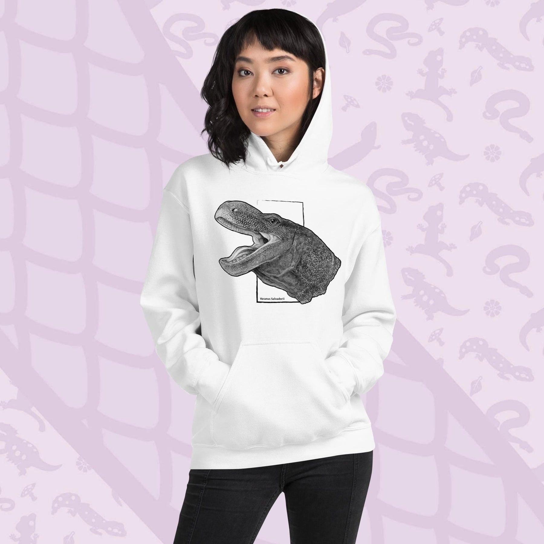 El monitor cocodrilo proviene de Nueva Guinea y se considera la especie de monitor más larga del mundo, ¡superando incluso a algunos dragones de Komodo! Aunque a veces estos salvadorii pueden ser suaves, creemos que la tela de nuestra sudadera con capucha es mucho más suave y definitivamente no es propensa a morder.