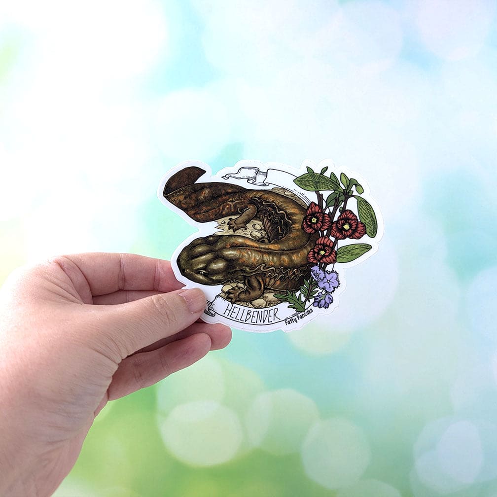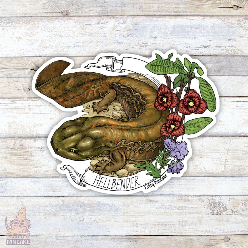 One of the most unique critters of North America is about to slip and slide it's way from the cold waters of of the Eastern Coast and into your home! The hellbender is the largest salamander found in the USA and an iconic creature well loved by amphibian and reptile enthusiasts alike. While endangered in the wild, this sticker is in abundance and with it's pawpaw flowers it will stick fast to any surface you like!